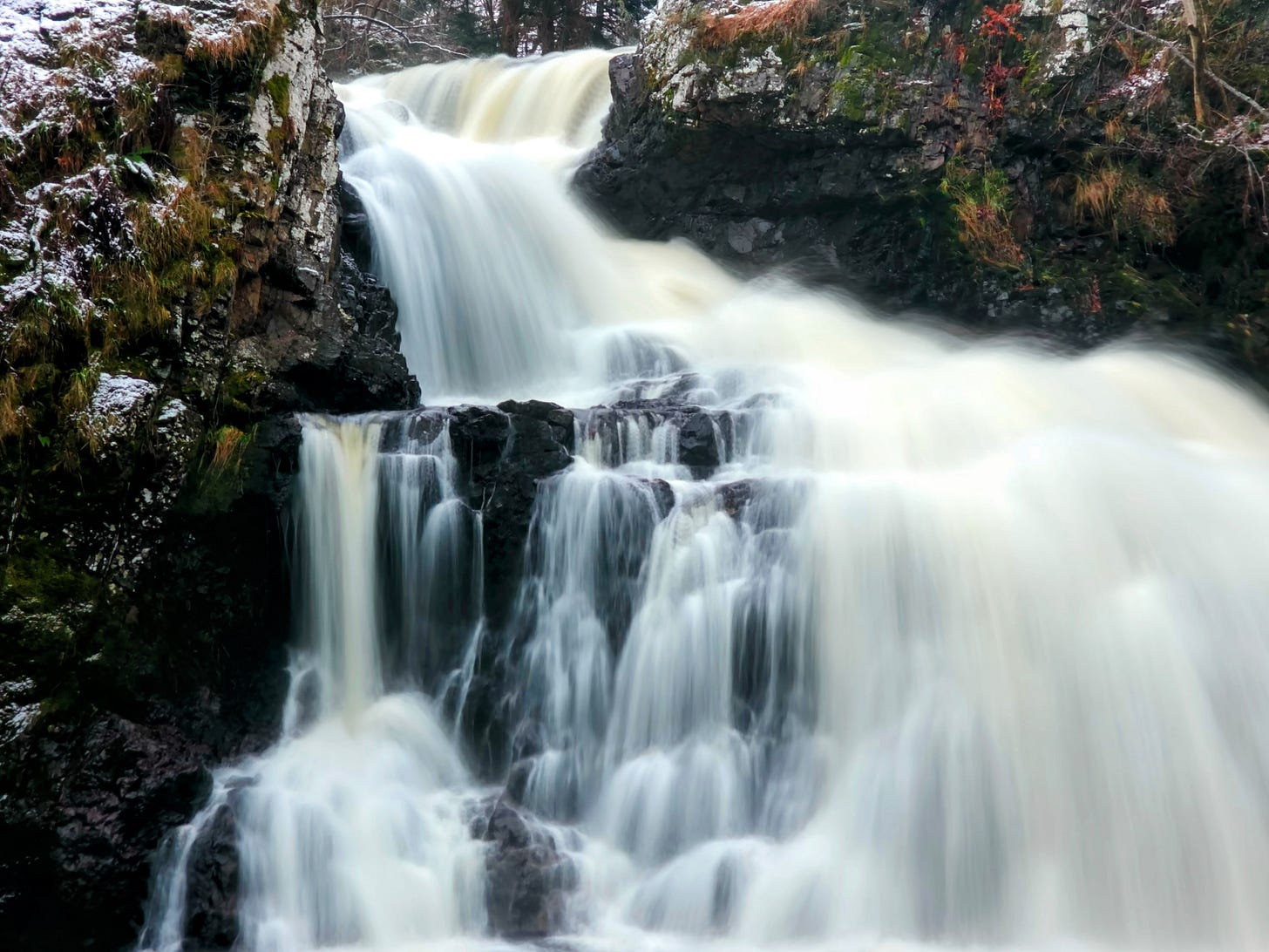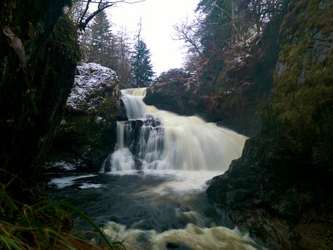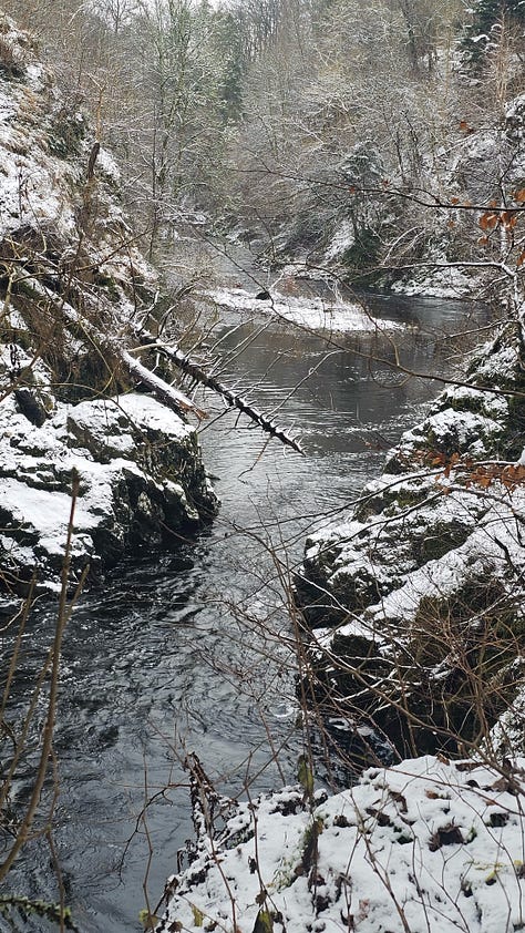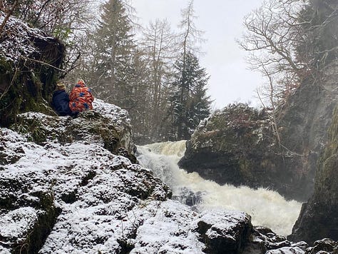 Yesterday, the hardcore crew braved the snowy roads to visit Reekie Linn, one of the most impressive waterfalls in our area and a favourite of ours. The excitement of snow-covered scenery was tempered by the not-so-thrilling drive, my hands gripping the steering wheel on skitery roads but what better way to spend a snowy January day in Scotland than nipping up the glen for a douk in a waterfall pool?